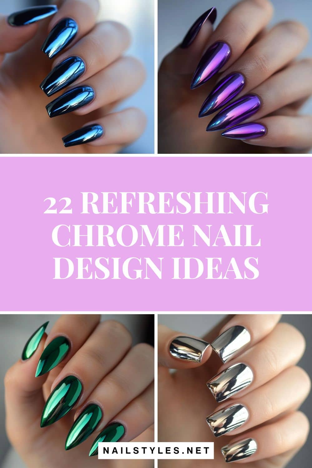 This shimmering light purple chrome design is delicate yet futuristic, ideal for a soft pop of color with a glossy sheen.