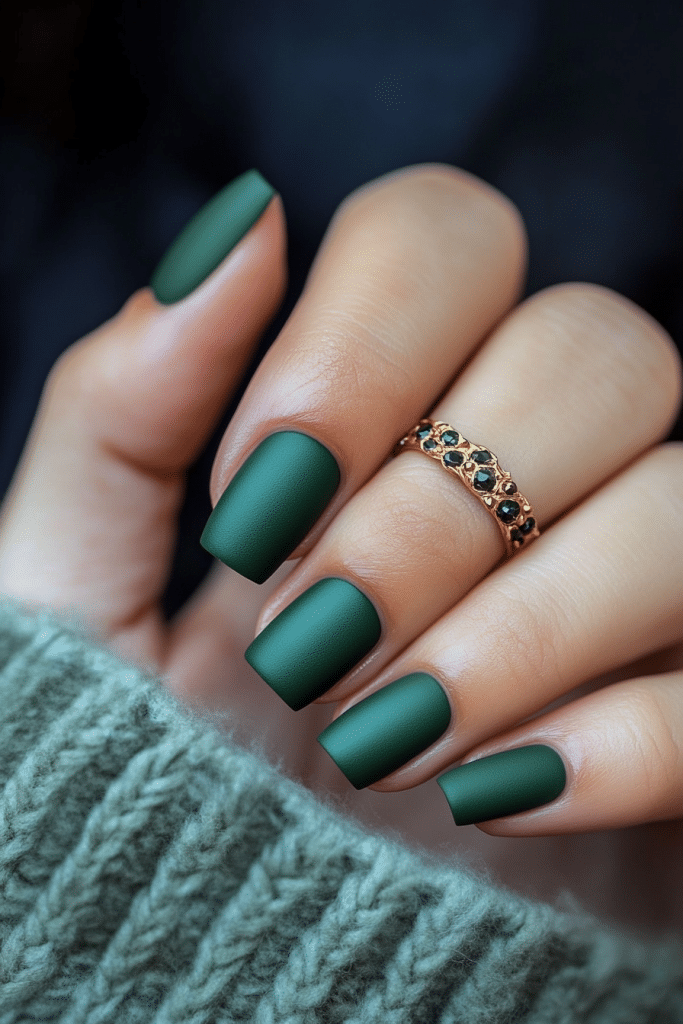 A deep mossy green shade with a matte topcoat for a trendy, earthy look.